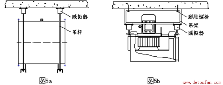 ①小型通風機可簡單地以螺桿吊掛安裝(圖5a),也可采用穩定性更好的吊架進行安裝(圖5b)。